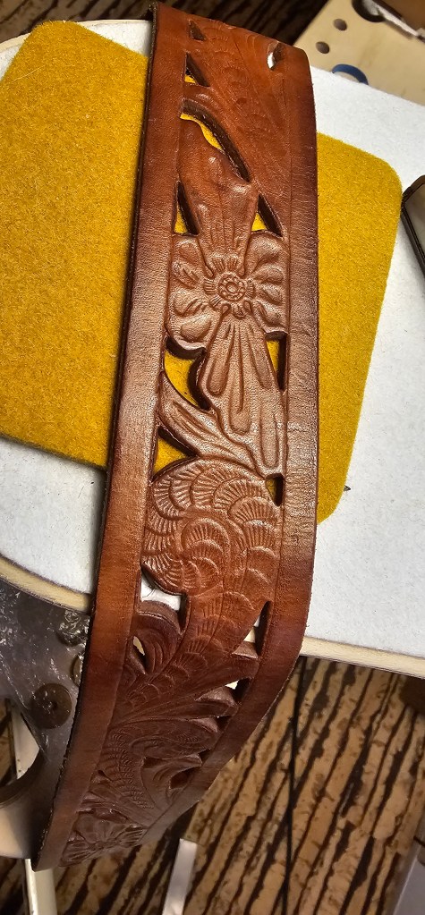 When the strap arrived from Mark @loft_relics_guitar_straps, it turned out my guess on length had been spot-on, and it looked terrific on the guitar, but I decided it’d look better if it were red instead of tan–and lightly antiqued to pop those fiddleheads. So Feibings. Thanks to Matt @matt_codinaleather for the timely antiquing advice.