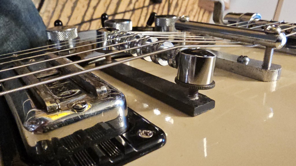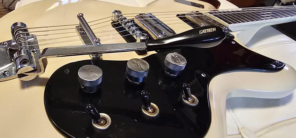 The Burns and the space control bridge (my least favorite gretsch bridge, but the threaded saddles roll helpfully) needed cleaning and lubrication. Once all of that was set, I could adjust spring tension and get a reliable return to pitch from slacked strings. It’s less reliable when the pitch is raised, but I haven’t been able to solve that completely without taking it flat after the pull. I had always wanted to try a Burns. They say to be careful with that stuff.