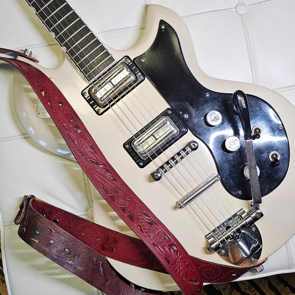 In 1964, Gretsch introduced a bizarre offset amalgam of their own Corvette and, pretty clearly, the Gibson SG. With a solid mahogany body and set neck, a bound 24 1/2″ (!) scale ebony fingerboard with neo-classical thumbnail inlays, and the new bladed variation of the Ray Butts Filtertron, the Super‘Tron, these were high end guitars.