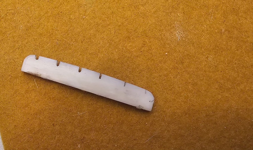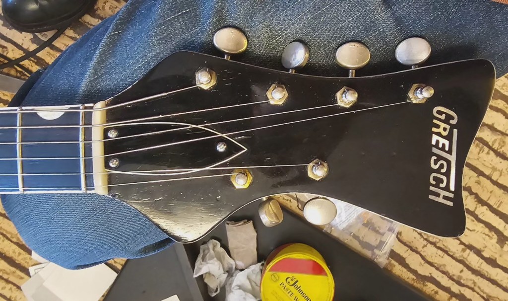 Somebody refinned this ’64 in thin white nitro a good ways back. It’s a very nice refin. The new (I guess) nut they made was less successful, poorly spaced, less than ideally angled, overly deep, and prone to binding.